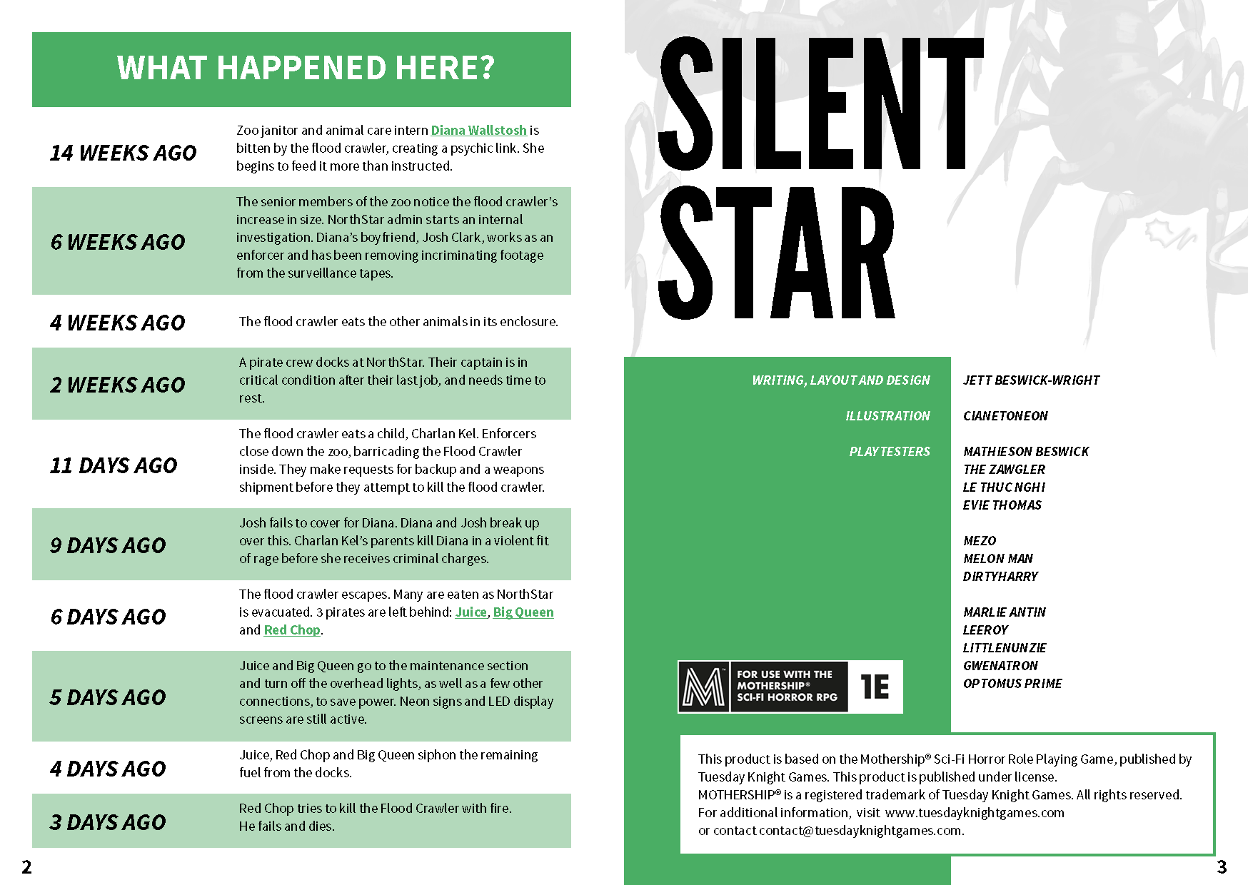 This product is based on the Mothership Sci-Fi Horror Role Playing Game, published by Tuesday Knight Games. This product is published under license. Mothership® is a registered trademark of Tuesday Knight Games. All rights reserved. For additional information, visit www.tuesdayknightgames.com or contact contact@tuesdayknightgames.com.